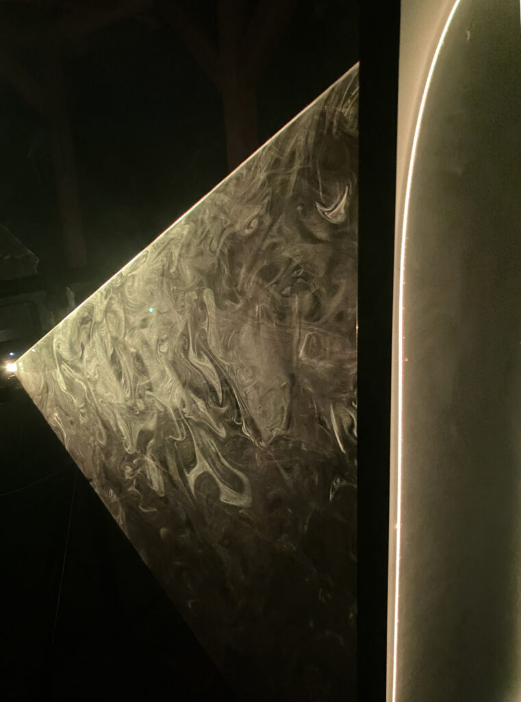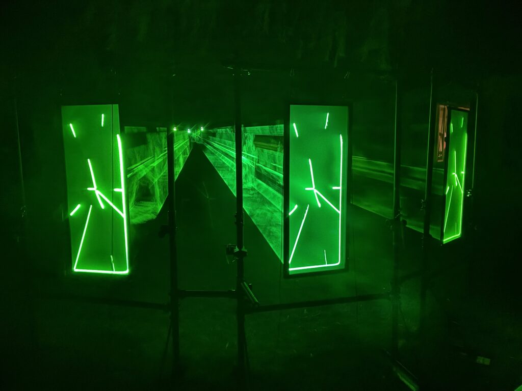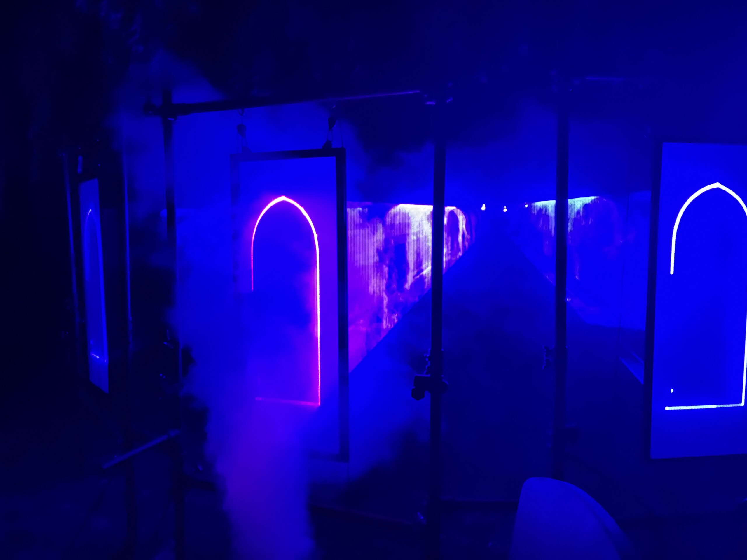 The next residency will further explore the dual perception offered by the frosted glass.By enabling the installation of the structures indoors, it will allow experimentation with different spatial configurations and ensure a consistent haze distribution, in order to carry out high-quality film and photographic documentation.