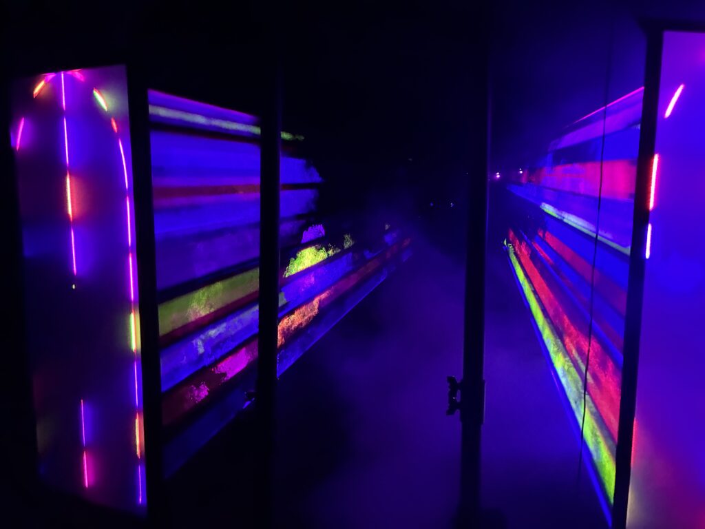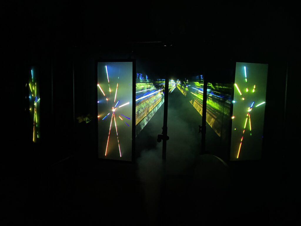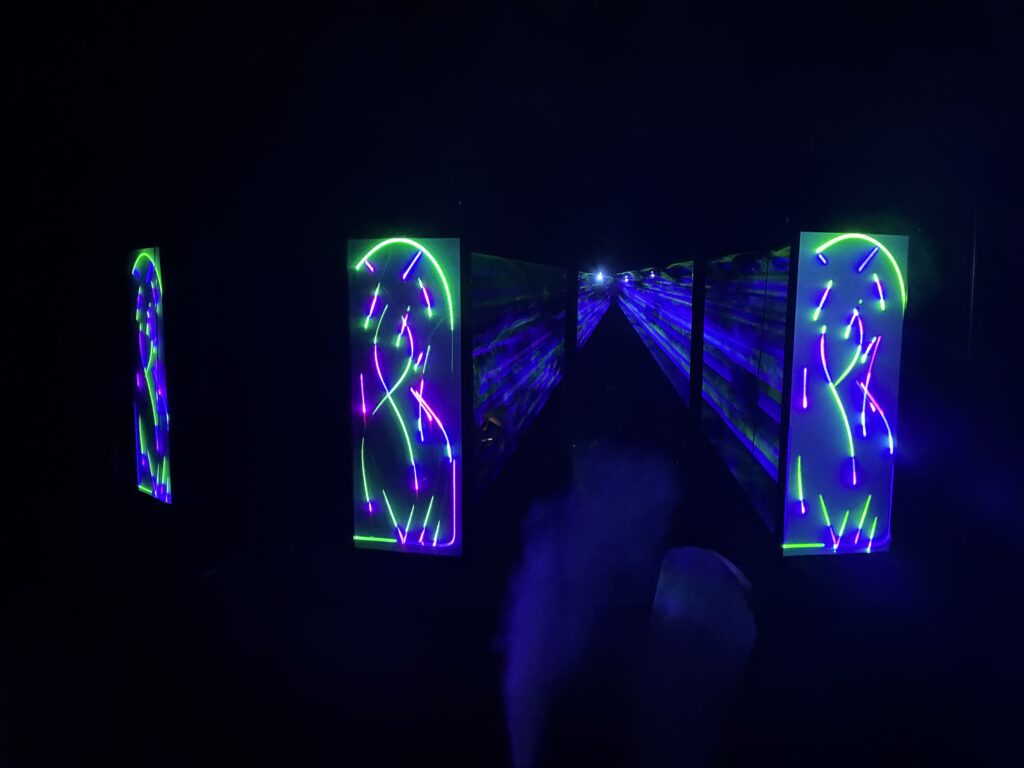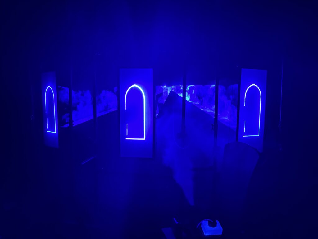 Arcana Trinitas is conceived as a door of perception: a liminal passage between two worlds, where light and sound trace a path from reality into a mirrored space.